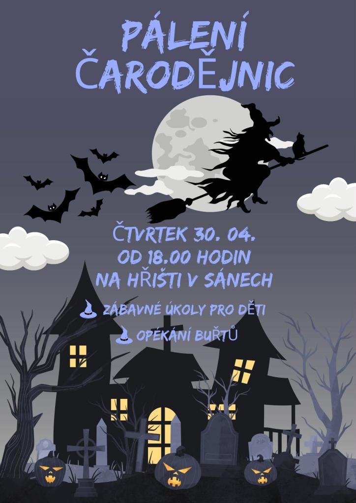 Přijďte na akci Pálení čarodějnic, která se uskuteční ve čtvrtek 30. dubna 2026 od 18:00 hodin na hřišti v Sánech. Čekají na vás zábavné úkoly a opékání buřtů pro všechny příchozí.