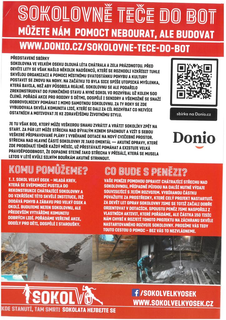 Sokolovna ve Velkém Oseku, která dlouhá léta chátrala, byla před devíti lety obnovena skupinou nadšenců. Ti se rozhodli vrátit tuto skvělou organizaci zpět do života a vytvořit z ní místo pro pohyb a kulturu. Dnes má Sokol kolem 500 členů a pořádá akce pro rodiny, dospělé i seniory. I přes dosažené úspěchy čelí sokolové velkému problému se střechou, která vyžaduje urgentní opravy. Bez nich hrozí, že by mohly být ohroženy všechny plány a dotace na nové cvičební prostory.