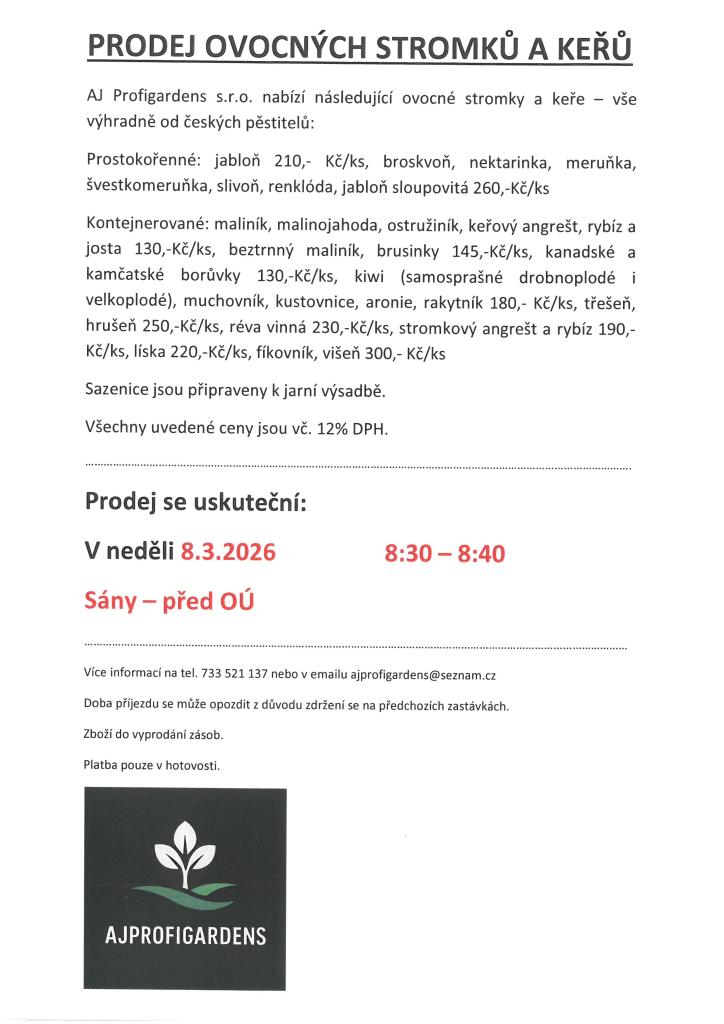 Společnost AJ Profigardens s.r.o. bude v naší obci prodávat ovocné stromky a keře od českých pěstitelů.