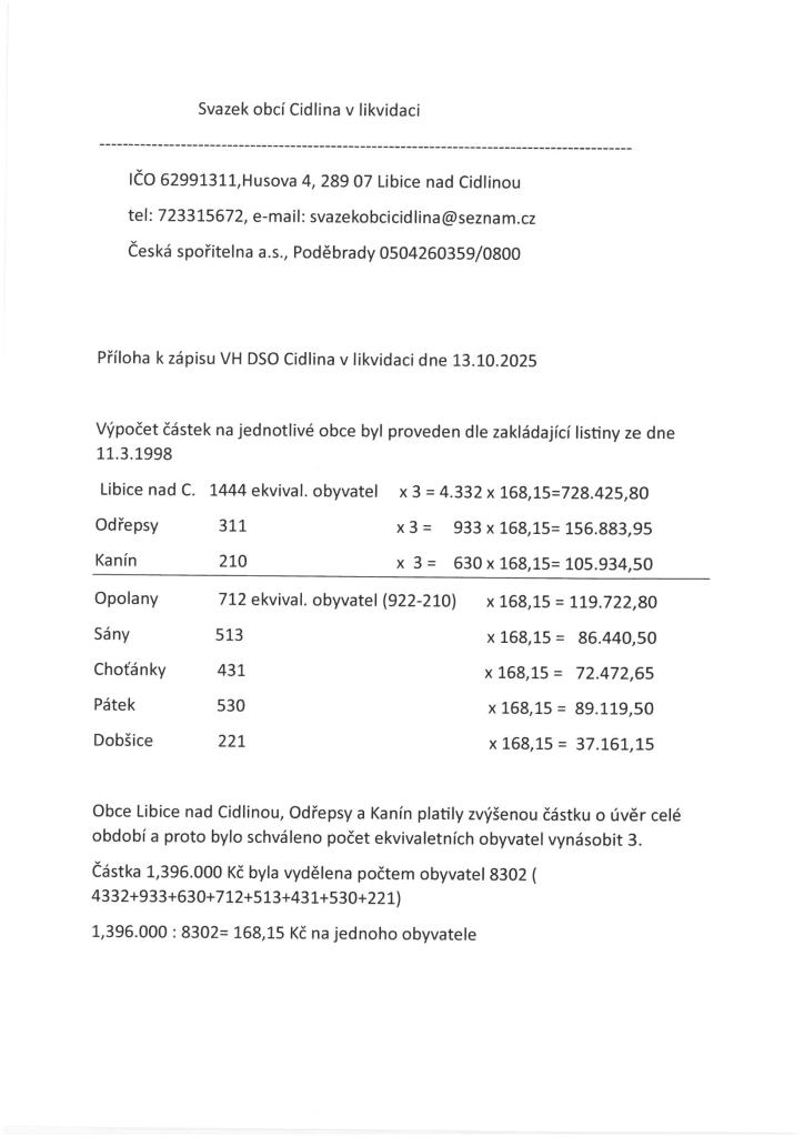 Dne 13. října 2025 se uskutečnila valná hromada Dobrovolného svazku obcí Cidlina na Obecním úřadu v Libici nad Cidlinou. V rámci této schůze se projednávaly důležité záležitosti týkající se svazku, který je v likvidaci. Účastníci byli informováni o dosavadním postupu.Zápis z této valné hromady bude zveřejněn pro potřeby všech zainteresovaných obcí.